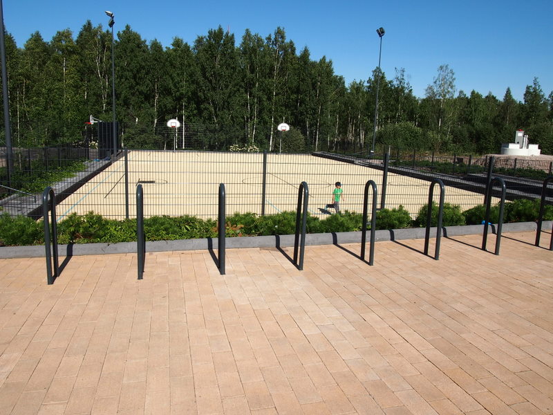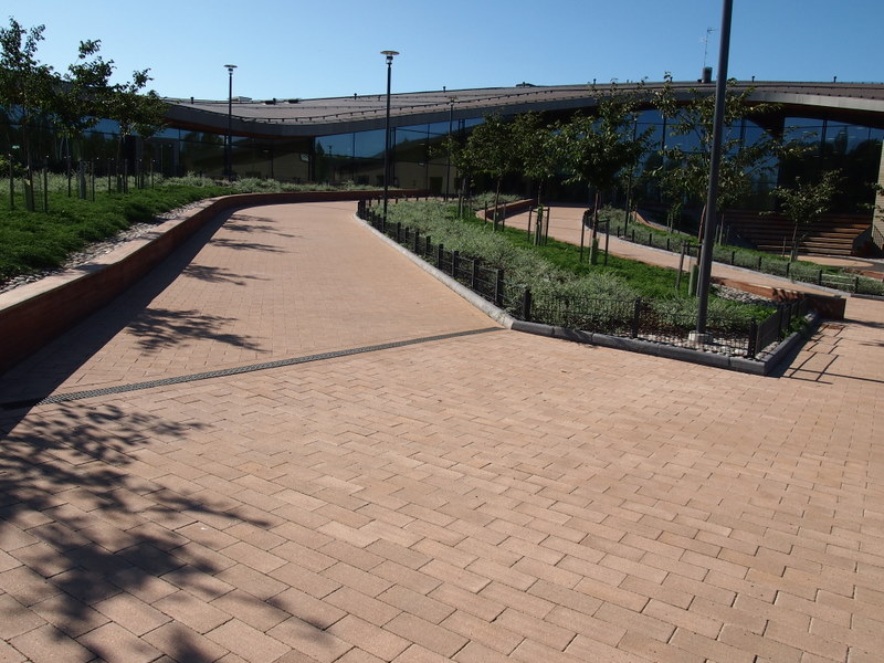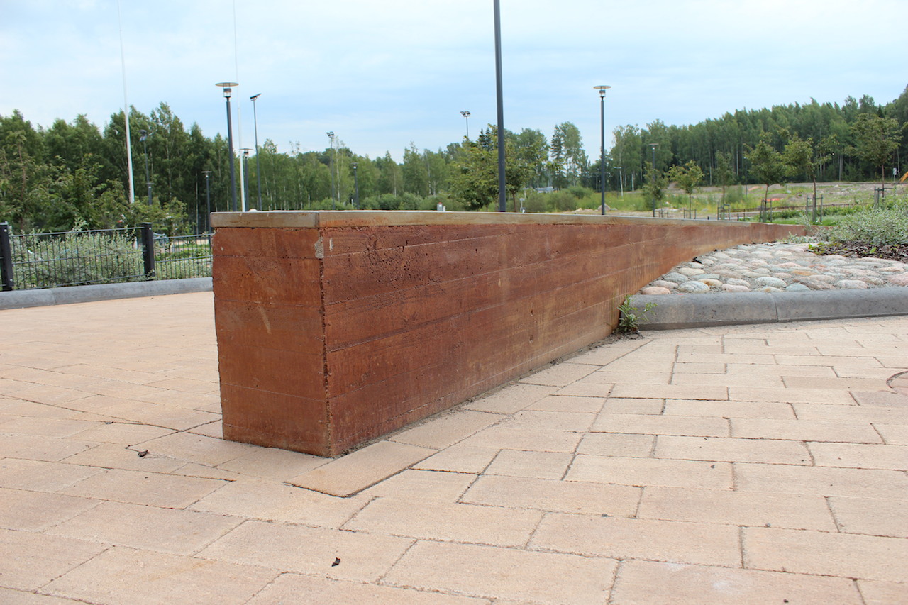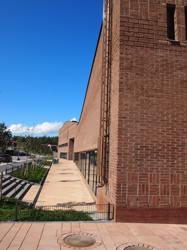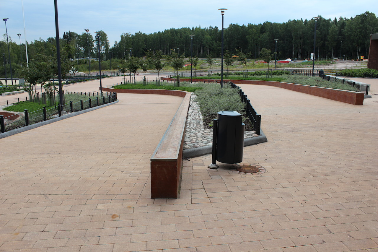 Hiekanruskeilla patinapintaisilla sauvakivillä päällystetyt piha-alueet ja kevyen liikenteen väylät muodostavat tasaiset, esteettömät kulkupinnat. Pihan tiilenruskeiden paikallavalettujen tukimuurien rautaoksidikäsittely liittää ne kauniisti rakennuksen muurattuun julkisivuun