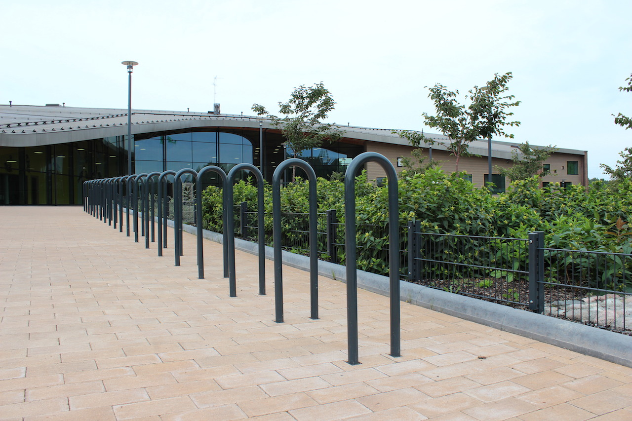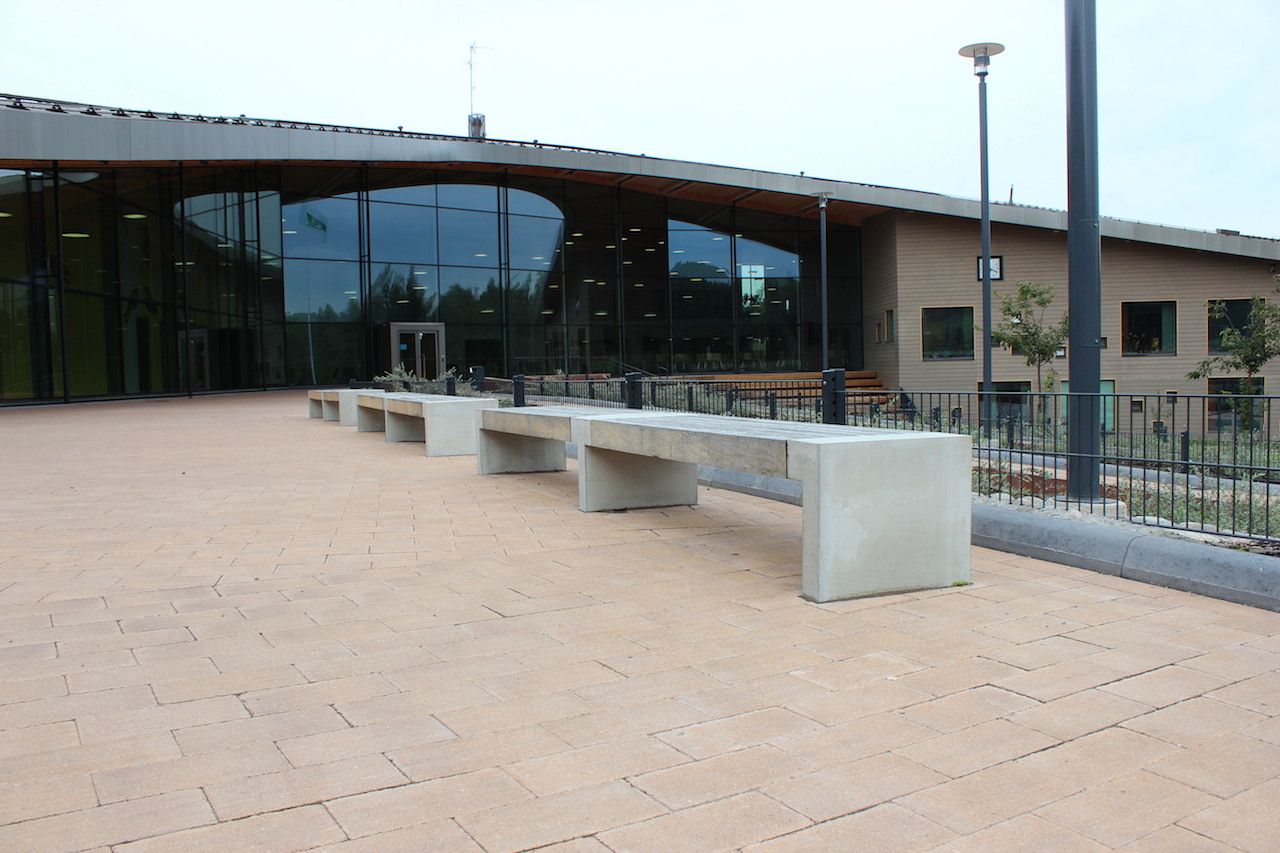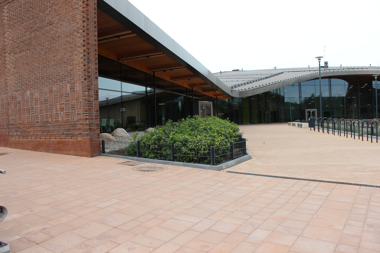 Hiekanruskeilla patinapintaisilla sauvakivillä päällystetyt piha-alueet ja kevyen liikenteen väylät muodostavat tasaiset, esteettömät kulkupinnat. Pihan tiilenruskeiden paikallavalettujen tukimuurien rautaoksidikäsittely liittää ne kauniisti rakennuksen muurattuun julkisivuun