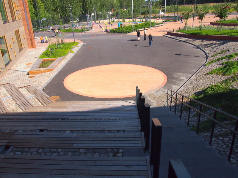 Rinnetontin korkeuserot on hyödynnetty terassoituvassa pihassa, joka kiertyy ruokasalin edustalla ulkoteatteriksi. Ulkoilmateatteri kokoaa sisä- ja ulkotilat yhdeksi kokonaisuudeksi. Teatterin näyttämö sijaitsee pihalla nuorempien ja vanhempien oppilaiden pihojen liittymäkohdassa. Isompi liikuntakenttä, Saunalahdenkenttä (65x100m), sijoittuu tontin pohjoisosaan ja pienempi, Magneettikenttä (20x40m) lähiliikuntapaikkoineen, Kompassitorin yhteyteen.