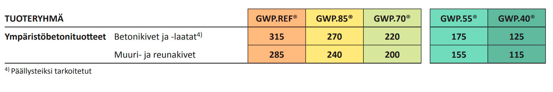 Luokitus ja laskuri on tarkoitettu vain Suomessa tehtäville valmisbetoneille, betonielementtien betoneille sekä harkko- ja ympäristöbetonituotteille, koska referenssiarvot perustuvat suomalaisiin raaka-aineisiin ja energiatietoihin. On hyvä muistaa, että myös GWP.REF-luokan betonit ovat keskimääräisiä perinteisiä betoneita päästöiltään pienempiä.