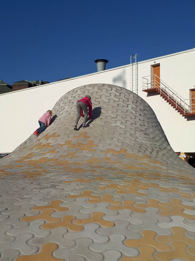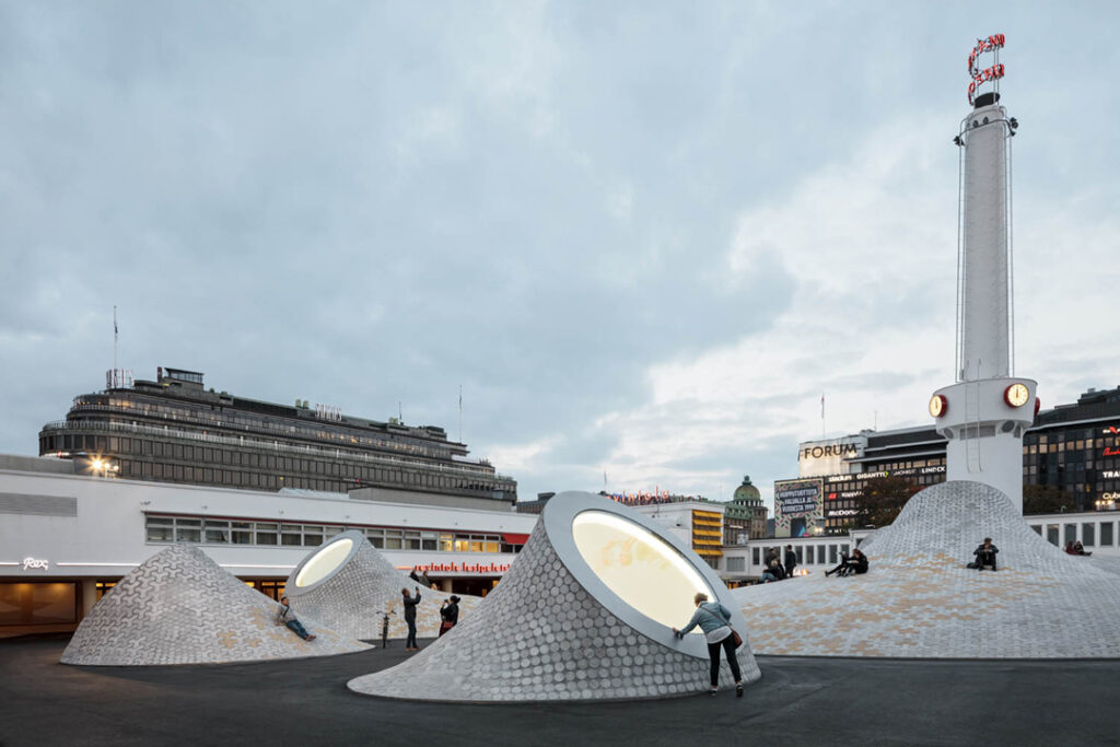 Lähestyessään Amos Rexiä tulija näkee ensin kumpareet ja kummut ulkona. Kun hän tulee sisälle ja maan alle, sama muoto löytyy sieltä koverana pintana näyttelysalien katossa ja kattoikkunoissa. Vaikka ollaan maan alla, ollaan osa kaupunkia.