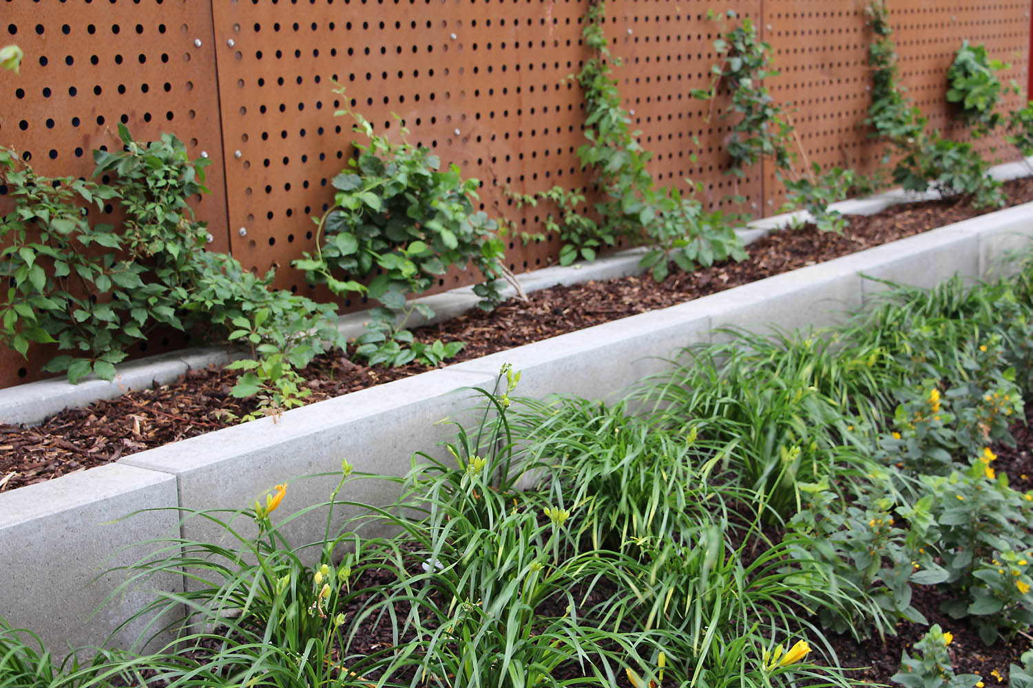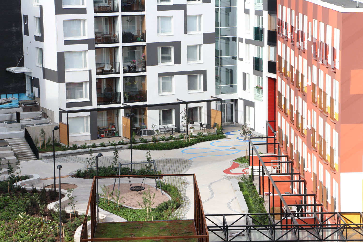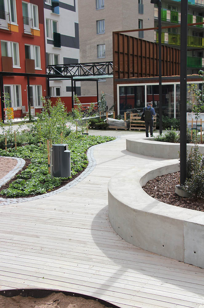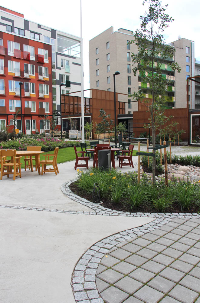 Sisäpihalla on yhdistelty eri muotoja ja materiaaleja. Hauska serpentiinikuvio seikkailee pitkin pihaa. Pehmeät muodot toistuvat istutusalueissa, muureissa ja kiviladonnoissa. Värit ja pinnat sointuvat kauniisti ympäröiviin rakennuksiin. Porraskiviä on käytetty perinteisen portaan lisäksi myös istutusaltaiden reunuksissa.